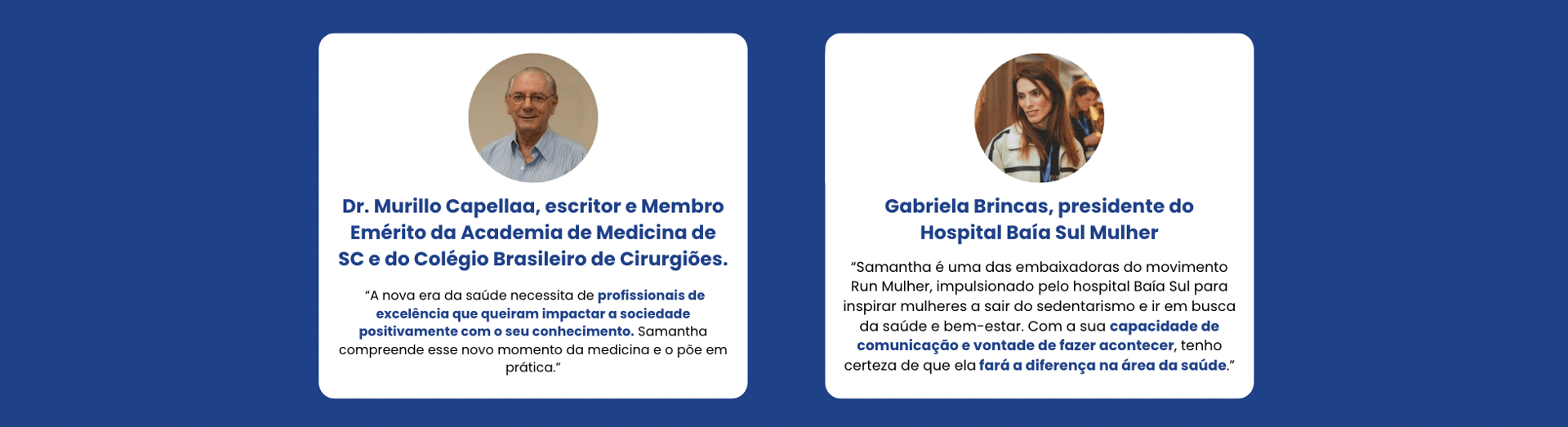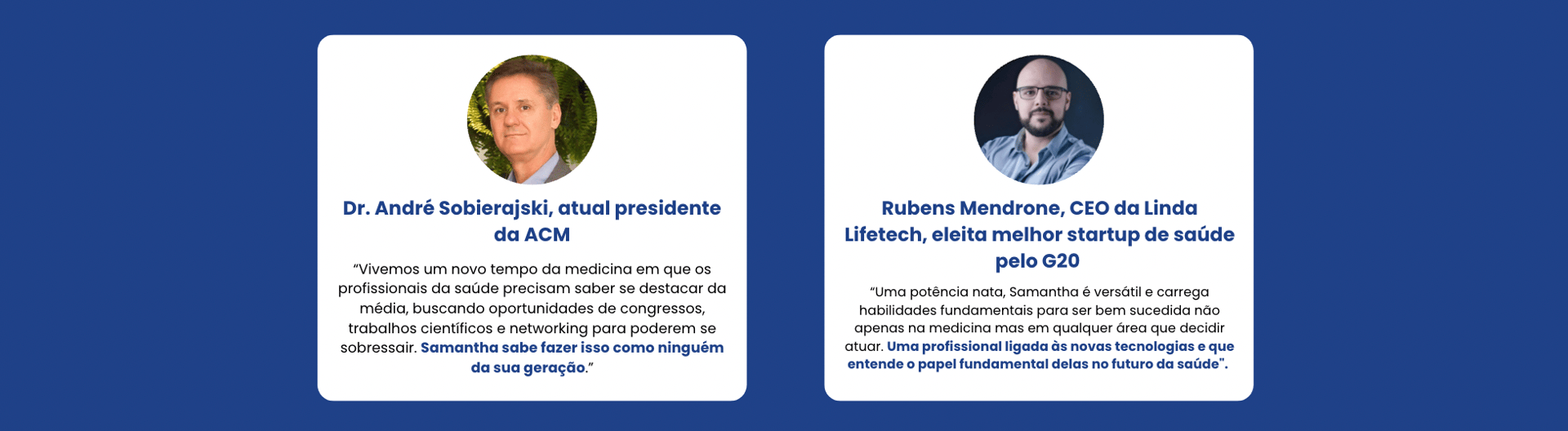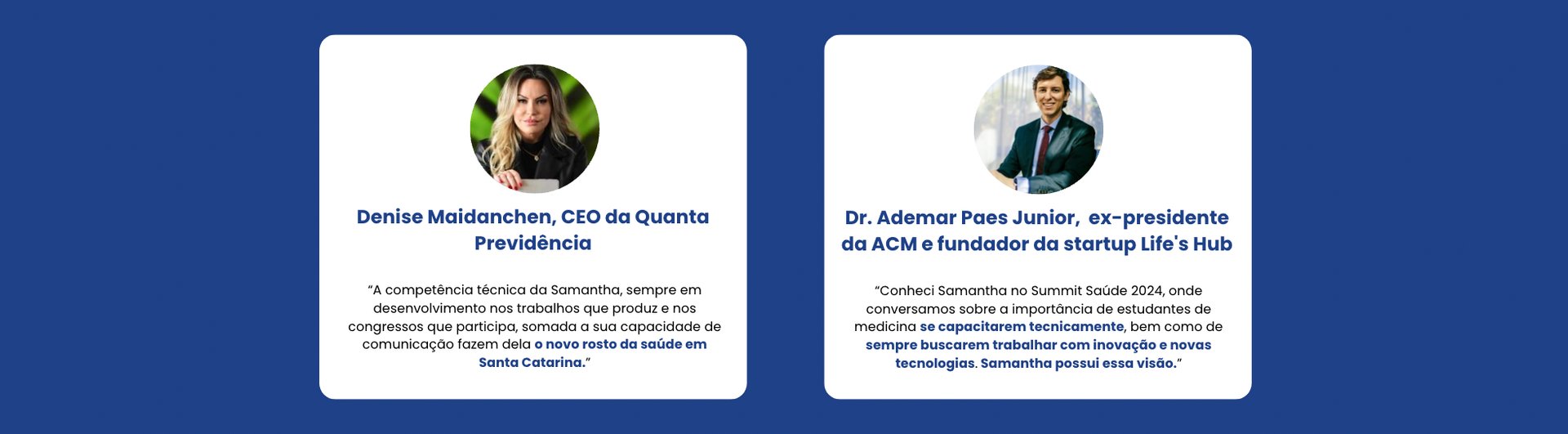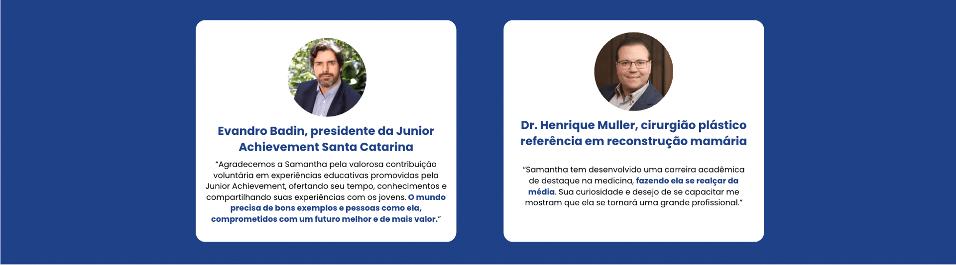 Samantha é estudante de Medicina na UFSC. Foi voluntária na Júnior Achievement, integra o LIDE Futuro SC, e desenvolve projetos de empreendedorismo voltados às frentes de educação, inovação, e novas tecnologias na área de saúde.